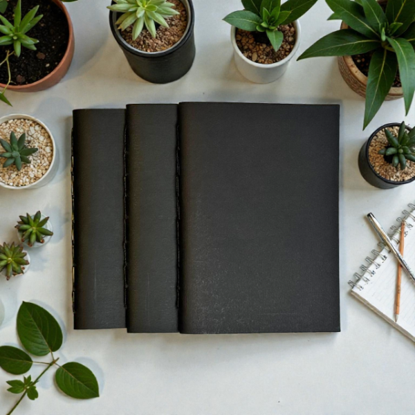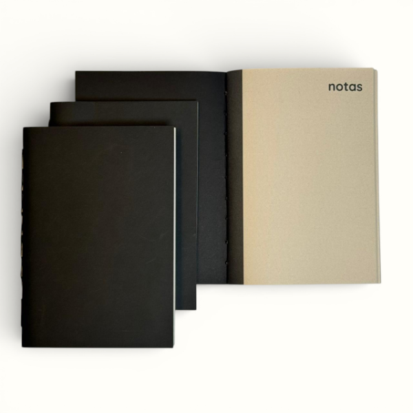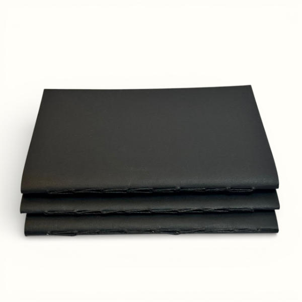 Un pack de 3 libretas artesanales A5 en negro profundo y uniforme. Un clásico atemporal, sobrio y versátil.