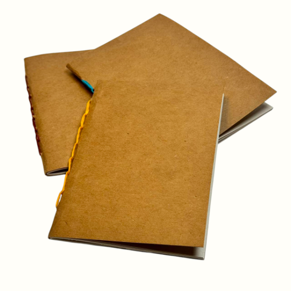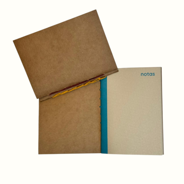 Cada libreta está cosida a mano en costura cadeneta, cada una con hilo a tono según la paleta. Las portadas son de cartulina craft 250 g y el interior cuenta con 20 hojas de papel Ledesma Natural 80 g, color hueso, lisas.